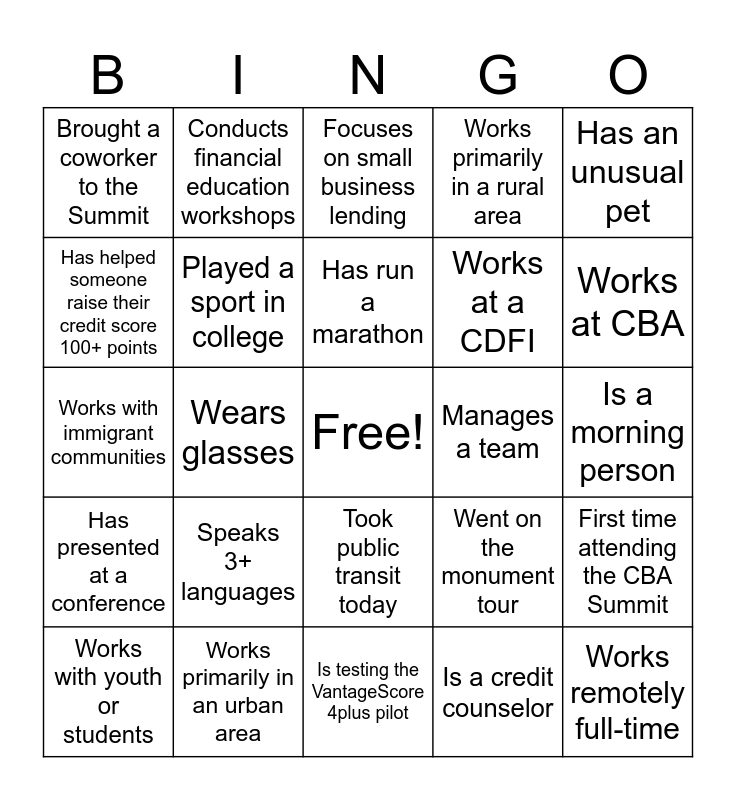This bingo card has a free space and 28 words: First time attending the CBA Summit, Has attended 5+ CBA events, Works at a CDFI, Is a credit counselor, Has helped someone raise their credit score 100+ points, Focuses on small business lending, Conducts financial education workshops, Has presented at a conference, Manages a team, Works with youth or students, Works with immigrant communities, Works primarily in a rural area, Works primarily in an urban area, Is testing the VantageScore 4plus pilot, Works at CBA, Works with a predominantly Spanish-speaking population, Speaks 3+ languages, Played a sport in college, Has run a marathon, Took public transit today, Brought a coworker to the Summit, Grew up outside the U.S., Works remotely full-time, Wears glasses, Is a morning person, Went on the monument tour, Has an unusual pet and Doesn't drink coffee.