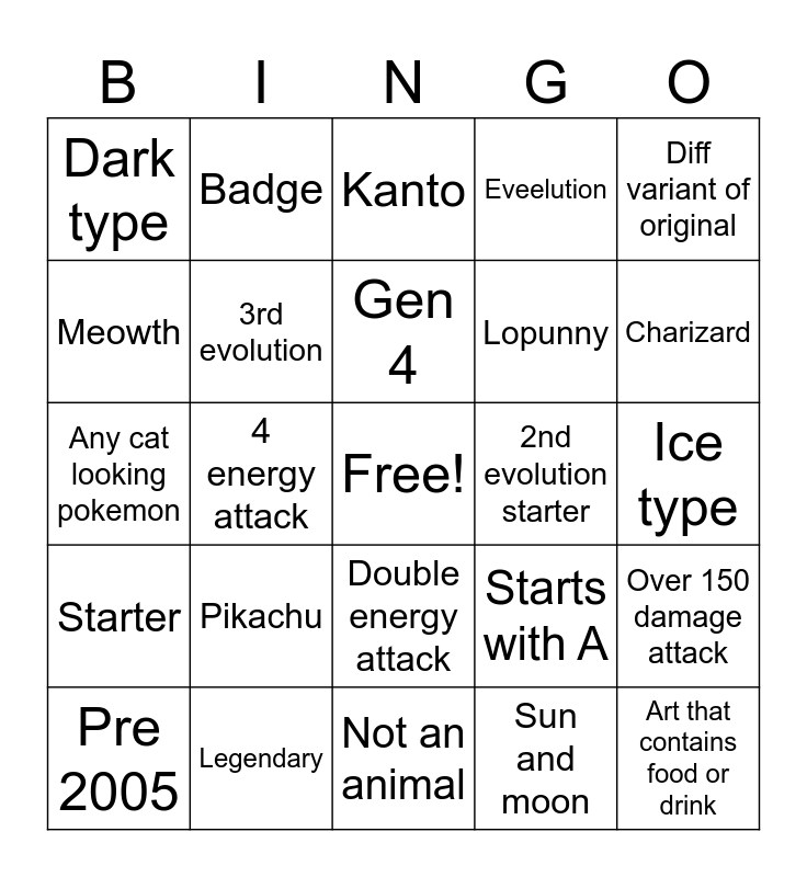 This bingo card has a free space and 24 words: Pikachu, Legendary, Gen 4, Pre 2005, Diff variant of original, Dark type, Meowth, Badge, 2nd evolution starter, Double energy attack, Lopunny, Any cat looking pokemon, Starts with A, Over 150 damage attack, 3rd evolution, Sun and moon, Ice type, Kanto, Charizard, 4 energy attack, Art that contains food or drink, Starter, Eveelution and Not an animal.