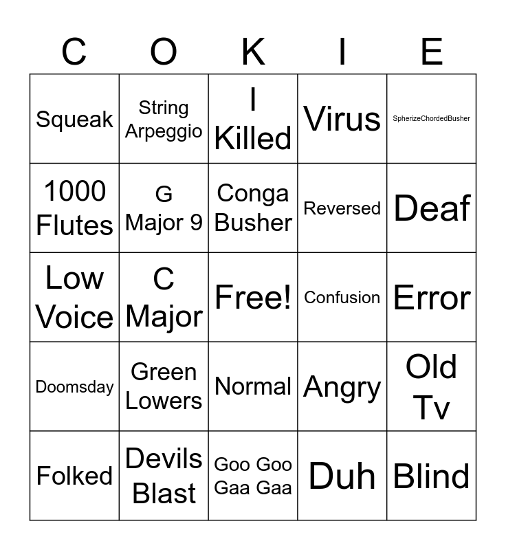 This bingo card has a free space and 26 words: Normal, Duh, Conga Busher, Devils Blast, SpherizeChordedBusher, Squeak, 1000 Flutes, String Arpeggio, Error, Angry, Reversed, Low Voice, Old Tv, Folked, C Major, Earth Tones, Virus, Doomsday, I Killed, Blind, Deaf, Goo Goo Gaa Gaa, Confusion, Green Lowers, G Major 9 and G Major 7.