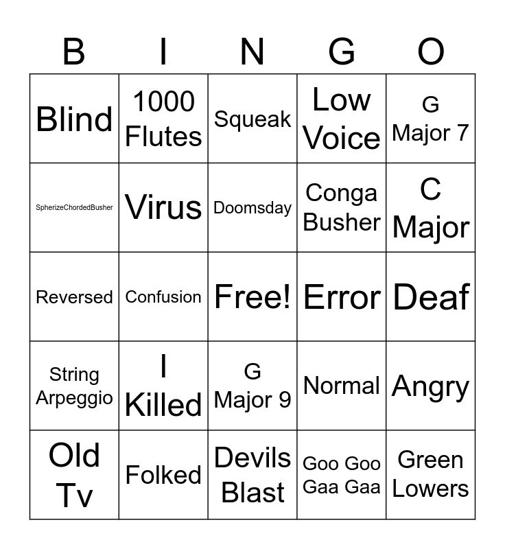 This bingo card has a free space and 27 words: Normal, Duh, Conga Busher, Devils Blast, SpherizeChordedBusher, Squeak, 1000 Flutes, String Arpeggio, Error, Angry, Reversed, Low Voice, Old Tv, Folked, C Major, Earth Tones, Virus, Doomsday, I Killed, Blind, Deaf, Goo Goo Gaa Gaa, Confusion, Green Lowers, G Major 9, G Major 7 and Confusion.