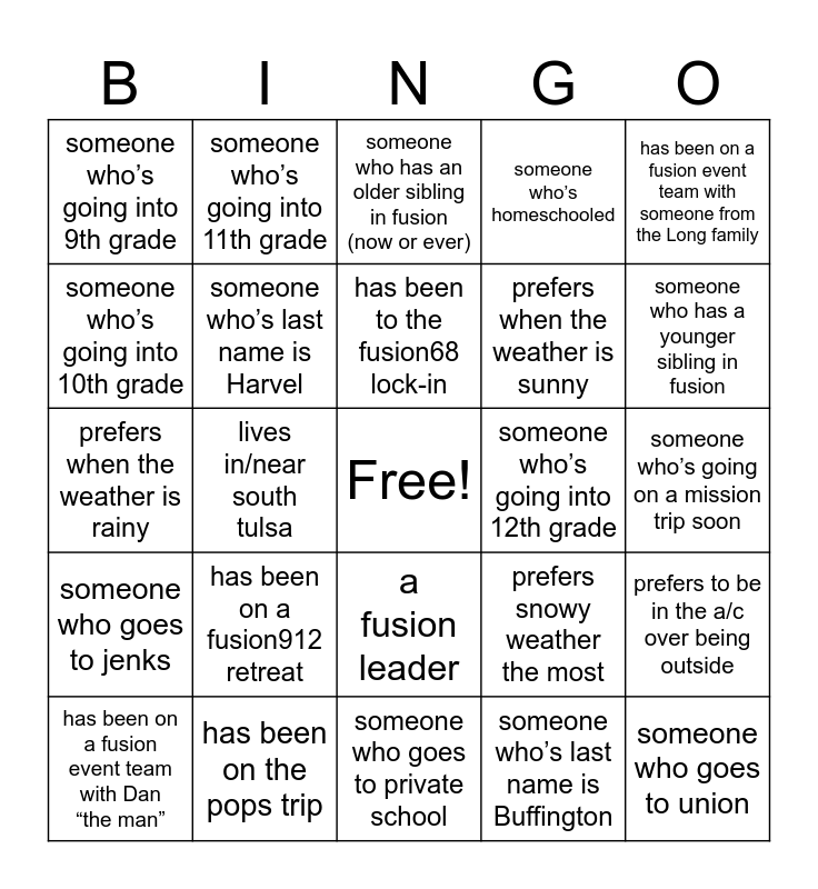 This bingo card has a free space and 24 words: has been on a fusion912 retreat, has been on the pops trip, has been to the fusion68 lock-in, has been on a fusion event team with Dan “the man”, has been on a fusion event team with someone from the Long family, someone who’s going into 9th grade, someone who’s going into 10th grade, someone who’s going into 11th grade, someone who’s going into 12th grade, a fusion leader, prefers when the weather is sunny, prefers when the weather is rainy, prefers snowy weather the most, prefers to be in the a/c over being outside, someone who’s last name is Harvel, someone who’s last name is Buffington, someone who’s going on a mission trip soon, someone who has an older sibling in fusion (now or ever), someone who has a younger sibling in fusion, lives in/near south tulsa, someone who goes to union, someone who goes to jenks, someone who’s homeschooled and someone who goes to private school.