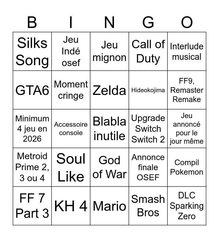 This bingo card has a free space and 24 words: Soul Like, KH 4, Zelda, FF 7 Part 3, Interlude musical, Silks Song, GTA6, Jeu Indé osef, Upgrade Switch Switch 2, God of War, Hideokojima, Minimum 4 jeu en 2026, Annonce finale OSEF, Compil Pokemon, Moment cringe, Smash Bros, Jeu annoncé pour le jour même, Jeu mignon, FF9, Remaster Remake, Accessoire console, DLC Sparking Zero, Metroid Prime 2, 3 ou 4, Call of Duty and Mario.