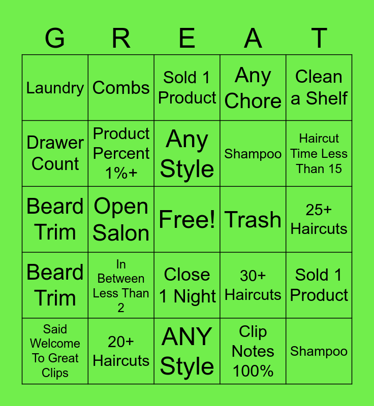 This bingo card has a free space and 24 words: In Between Less Than 2, 20+ Haircuts, Any Style, Said Welcome To Great Clips, Clean a Shelf, Laundry, Drawer Count, Combs, Trash, Close 1 Night, Shampoo, Beard Trim, 30+ Haircuts, Sold 1 Product, Product Percent 1%+, Clip Notes 100%, 25+ Haircuts, Sold 1 Product, Haircut Time Less Than 15, Open Salon, Shampoo, Beard Trim, Any Chore and ANY Style.