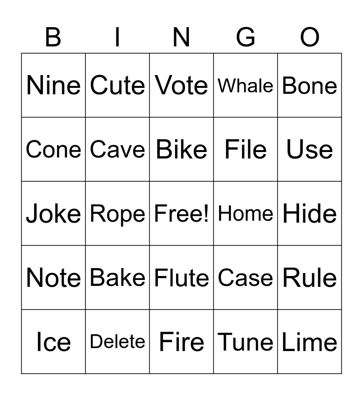 This bingo card has a free space and 24 words: Bake, Delete, Bike, Ice, Bone, Nine, Cone, Cute, Home, Flute, File, Joke, Case, Rule, Cave, Tune, Hide, Vote, Use, Rope, Lime, Note, Whale and Fire.