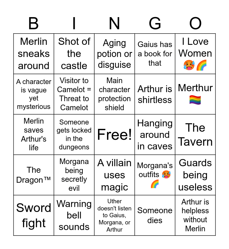 This bingo card has a free space and 24 words: Morgana being secretly evil, Warning bell sounds, Main character protection shield, Sword fight, I Love Women π₯΅π, Merlin sneaks around, A character is vague yet mysterious, Shot of the castle, Hanging around in caves, A villain uses magic, Arthur is shirtless, Merlin saves Arthur's life, Morgana's outfits π₯΅π, Guards being useless, Visitor to Camelot = Threat to Camelot, Someone dies, The Tavern, Aging potion or disguise, Merthur π³οΈβπ, Someone gets locked in the dungeons, Arthur is helpless without Merlin, The Dragonβ’, Gaius has a book for that and Uther doesn't listen to Gaius, Morgana, or Arthur.
