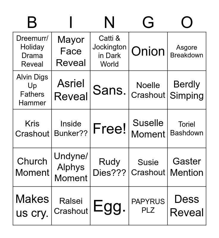This bingo card has a free space and 24 words: Undyne/ Alphys Moment, Ralsei Crashout, Sans., Makes us cry., Asgore Breakdown, Dreemurr/ Holiday Drama Reveal, Alvin Digs Up Fathers Hammer, Mayor Face Reveal, Suselle Moment, Rudy Dies???, Noelle Crashout, Kris Crashout, Susie Crashout, Gaster Mention, Asriel Reveal, PAPYRUS PLZ, Toriel Bashdown, Catti & Jockington in Dark World, Berdly Simping, Inside Bunker??, Dess Reveal, Church Moment, Onion and Egg..