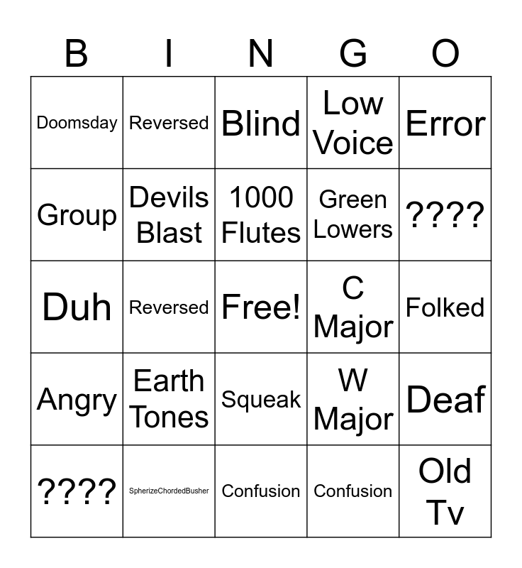 This bingo card has a free space and 41 words: Normal, Duh, Conga Busher, Devils Blast, SpherizeChordedBusher, Squeak, 1000 Flutes, String Arpeggio, Error, Angry, Reversed, Low Voice, Old Tv, Folked, C Major, Earth Tones, Virus, Doomsday, I Killed, Blind, Deaf, Goo Goo Gaa Gaa, Confusion, Green Lowers, G Major 9, G Major 7, Confusion, Crying, ????, Sad, Ltkc Map, Reversed, ????, Boul123Major, W Major, Group, PowerCityNight, G Major 4, Confusion Reversed, Chorded and G Major 54.