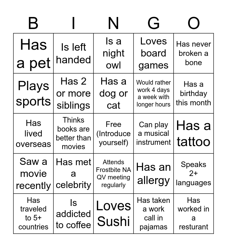 This bingo card has a free space and 24 words: Has met a celebrity, Is addicted to coffee, Has a dog or cat, Has traveled to 5+ countries, Has never broken a bone, Has a pet, Plays sports, Is left handed, Can play a musical instrument, Attends Frostbite NA QV meeting regularly, Would rather work 4 days a week with longer hours, Has lived overseas, Has an allergy, Speaks 2+ languages, Has 2 or more siblings, Has taken a work call in pajamas, Has a tattoo, Is a night owl, Has a birthday this month, Thinks books are better than movies, Has worked in a resturant, Saw a movie recently, Loves board games and Loves Sushi.