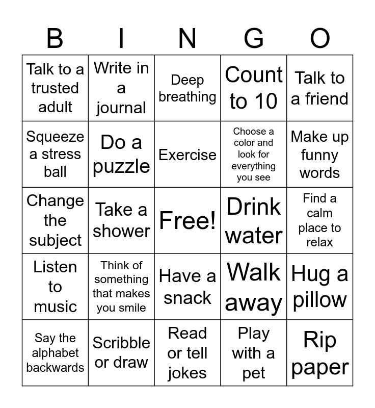 This bingo card has a free space and 24 words: Think of something that makes you smile, Scribble or draw, Exercise, Say the alphabet backwards, Talk to a friend, Talk to a trusted adult, Squeeze a stress ball, Write in a journal, Drink water, Have a snack, Choose a color and look for everything you see, Change the subject, Walk away, Hug a pillow, Do a puzzle, Play with a pet, Find a calm place to relax, Deep breathing, Make up funny words, Take a shower, Rip paper, Listen to music, Count to 10 and Read or tell jokes.