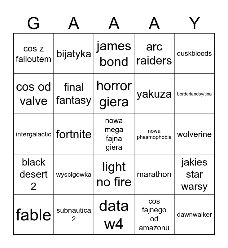 This bingo card has a free space and 24 words: wyscigowka, subnautica 2, horror giera, fable, duskbloods, cos z falloutem, cos od valve, bijatyka, nowa phasmophobia, light no fire, yakuza, intergalactic, marathon, jakies star warsy, final fantasy, cos fajnego od amazonu, wolverine, james bond, borderlandsy/tina, fortnite, dawnwalker, black desert 2, arc raiders and data w4.