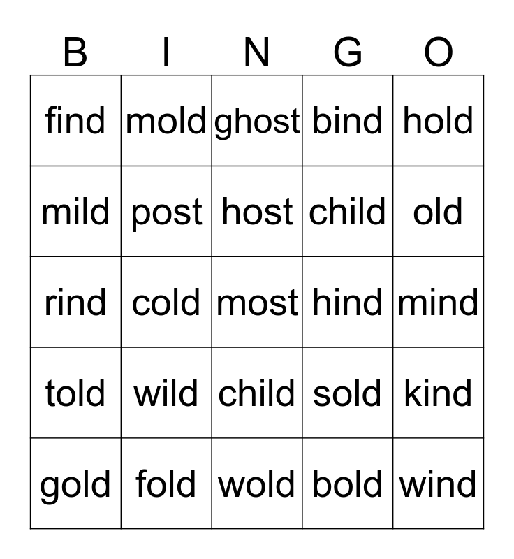 This bingo card has a free space and 24 words: wild, fold, host, gold, hold, find, mild, mold, hind, child, child, rind, sold, kind, post, bold, mind, ghost, old, cold, wind, told, bind and wold.