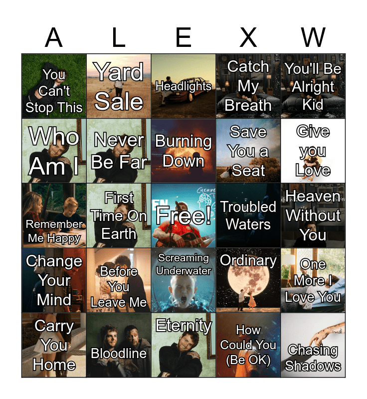 This bingo card has 24 images, a free space and 24 words: Before You Leave Me, Bloodline, Burning Down, Carry You Home, You'll Be Alright Kid, You Can't Stop This, Who Am I, Yard Sale, Troubled Waters, Screaming Underwater, Save You a Seat, Remember Me Happy, Ordinary, One More I Love You, Never Be Far, How Could You (Be OK), Heaven Without You, Headlights, Give you Love, First Time On Earth, Chasing Shadows, Change Your Mind, Catch My Breath and Eternity.