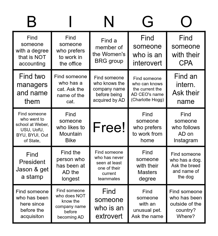 This bingo card has a free space and 24 words: Find the person who has been at AD the longest, Find someone who does NOT know the company name before becoming AD, Find someone who knows the company name before being acquired by AD, Find someone who has been here since before the acquisiton, Find someone with their CPA, Find someone with a degree that is NOT accounting, Find two managers and name them, Find someone who prefers to work in the office, Find someone who prefers to work from home, Find someone who has never seen at least one of their current teammates, Find someone who can knows the current the AD CEO's name (Charlotte Hogg), Find someone who went to school at Weber, USU, UofU, BYU, BYUI, Out of State,, Find someone with their Masters degree, Find someone who has a dog. Ask the breed and name of the dog, Find someone who has a cat. Ask the name of the cat., Find someone with an unusual pet. Ask the name, Find someone who follows AD on Instagram, Find a member of the Women's BRG group, Find an intern. Ask their name, Find someone who likes to Mountain Bike, Find someone who has been outside of the country? Where?, Find President Jason & get a stamp, Find someone who is an interovert and Find someone who is an extrovert.