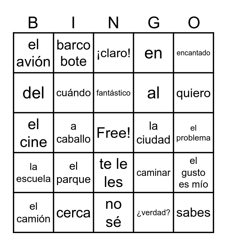 This bingo card has a free space and 29 words: el camión, la bicicleta, a caballo, a pie, el avión, ¡claro!, cuándo, el parque, la ciudad, cerca, el problema, sabes, no sé, ¿verdad?, quiero, porque, te le les, la escuela, encantado, el cine, caminar, la biblioteca, al, del, en, barco bote, el gusto es mío, fantástico and lejos de.