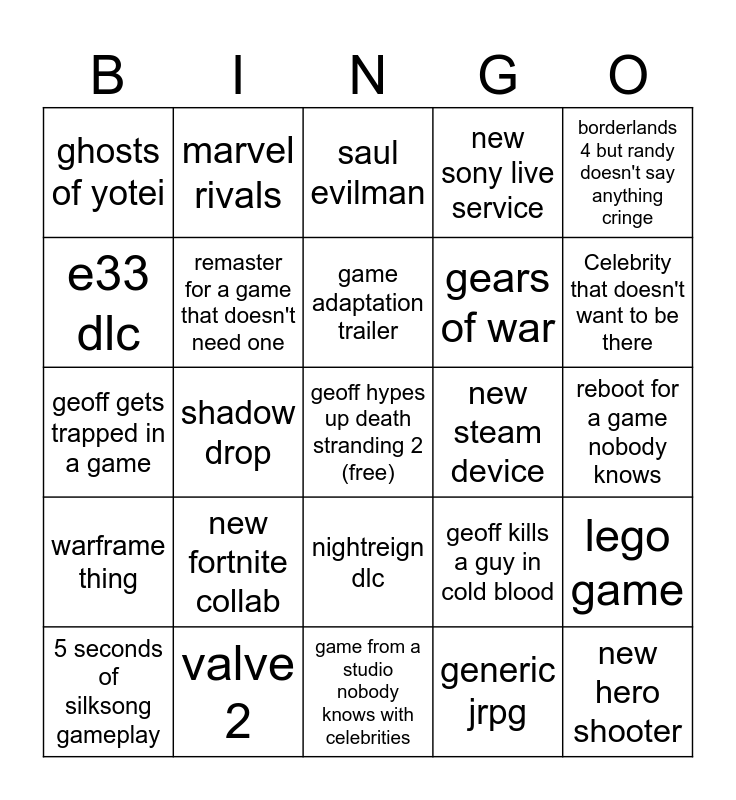 This bingo card has a free space and 24 words: new fortnite collab, valve 2, game adaptation trailer, 5 seconds of silksong gameplay, borderlands 4 but randy doesn't say anything cringe, ghosts of yotei, e33 dlc, marvel rivals, new steam device, nightreign dlc, gears of war, geoff gets trapped in a game, geoff kills a guy in cold blood, lego game, remaster for a game that doesn't need one, generic jrpg, reboot for a game nobody knows, saul evilman, Celebrity that doesn't want to be there, shadow drop, new hero shooter, warframe thing, new sony live service and game from a studio nobody knows with celebrities.