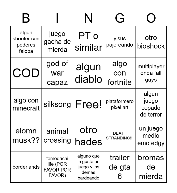 This bingo card has a free space and 24 words: animal crossing, tomodachi life (POR FAVOR POR FAVOR), algun diablo, borderlands, otro bioshock, algun shooter con poderes falopa, COD, juego gacha de mierda, plataformero pixel art, otro hades, algo con fortnite, algo con minecraft, DEATH STRANDING!!!, un juego medio emo edgy, god of war capaz, trailer de gta 6, algun juego copado de terror, PT o similar, multiplayer onda fall guys, silksong, bromas de mierda, elomn musk??, yisus pajereando and alguno que le guste un juego y los demas bardeando.