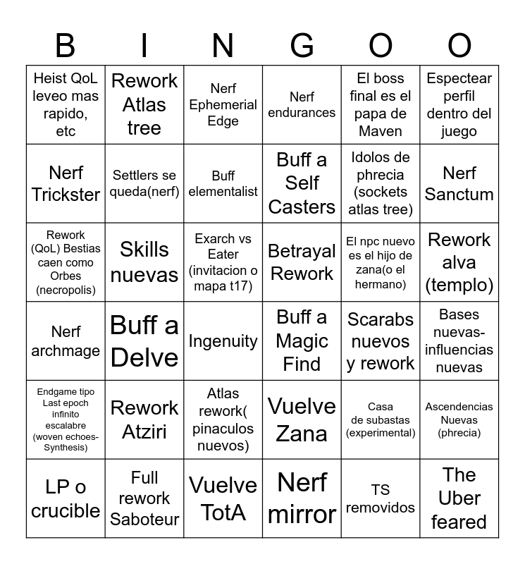 This bingo card has 36 words: Vuelve Zana, Atlas rework( pinaculos nuevos), Nerf mirror, Nerf Trickster, Nerf archmage, Betrayal Rework, Settlers se queda(nerf), Vuelve TotA, El boss final es el papa de Maven, Casa de subastas (experimental), Nerf Sanctum, Nerf endurances, Ascendencias Nuevas (phrecia), Skills nuevas, Buff a Self Casters, Heist QoL leveo mas rapido, etc, Endgame tipo Last epoch infinito escalabre (woven echoes-Synthesis), El npc nuevo es el hijo de zana(o el hermano), Rework (QoL) Bestias caen como Orbes (necropolis), Nerf Ephemerial Edge, Exarch vs Eater (invitacion o mapa t17), Buff a Delve, Buff a Magic Find, Ingenuity, Scarabs nuevos y rework, Rework Atlas tree, Idolos de phrecia (sockets atlas tree), Full rework Saboteur, Buff elementalist, Espectear perfil dentro del juego, The Uber feared, LP o crucible, Bases nuevas- influencias nuevas, Rework alva (templo), Rework Atziri and TS removidos.