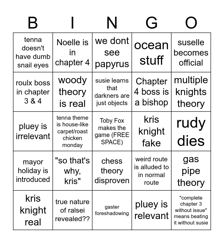 This bingo card has a free space and 24 words: "so that's why, kris", true nature of ralsei revealed??, susie learns that darkners are just objects, kris knight real, suselle becomes official, tenna doesn't have dumb snail eyes, roulx boss in chapter 3 & 4, Noelle is in chapter 4, kris knight fake, chess theory disproven, Chapter 4 boss is a bishop, pluey is irrelevant, weird route is alluded to in normal route, gas pipe theory, woody theory is real, pluey is relevant, rudy dies, we dont see papyrus, multiple knights theory, tenna theme is house-like carpet/roast chicken monday, "complete chapter 3 without issue" means beating it without susie, mayor holiday is introduced, ocean stuff and gaster foreshadowing.