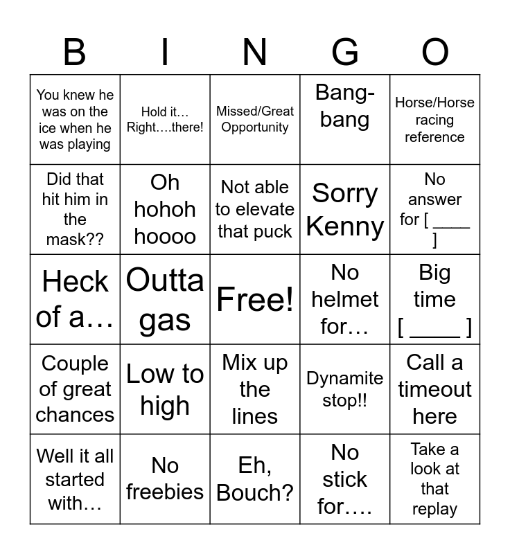 This bingo card has a free space and 24 words: Low to high, No freebies, Not able to elevate that puck, Well it all started with…, Horse/Horse racing reference, You knew he was on the ice when he was playing, Did that hit him in the mask??, Hold it…Right….there!, No helmet for…, Mix up the lines, Sorry Kenny, Heck of a…, Dynamite stop!!, Call a timeout here, Oh hohoh hoooo, No stick for…., Big time [ ____ ], Missed/Great Opportunity, No answer for [ ____ ], Outta gas, Take a look at that replay, Couple of great chances, Bang-bang and Eh, Bouch?.