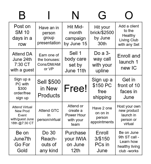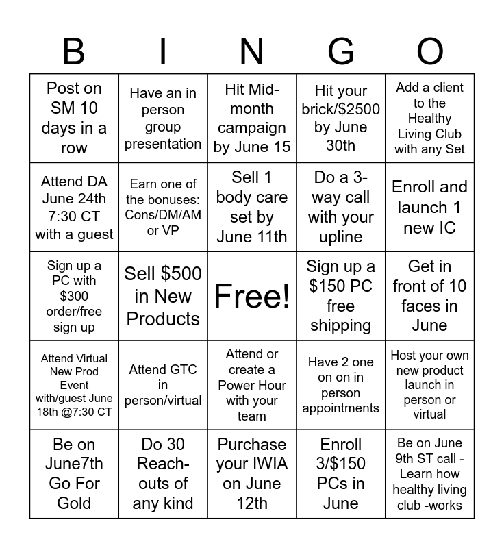 This bingo card has a free space and 24 words: Attend GTC in person/virtual, Do 30 Reach-outs of any kind, Sell 1 body care set by June 11th, Be on June7th Go For Gold, Add a client to the Healthy Living Club with any Set, Post on SM 10 days in a row, Attend DA June 24th 7:30 CT with a guest, Have an in person group presentation, Sign up a $150 PC free shipping, Attend or create a Power Hour with your team, Do a 3-way call with your upline, Sign up a PC with $300 order/free sign up, Have 2 one on on in person appointments, Host your own new product launch in person or virtual, Earn one of the bonuses: Cons/DM/AM or VP, Enroll 3/$150 PCs in June, Get in front of 10 faces in June, Hit Mid-month campaign by June 15, Enroll and launch 1 new IC, Sell $500 in New Products, Be on June 9th ST call -Learn how healthy living club -works, Attend Virtual New Prod Event with/guest June 18th @7:30 CT, Hit your brick/$2500 by June 30th and Purchase your IWIA on June 12th.
