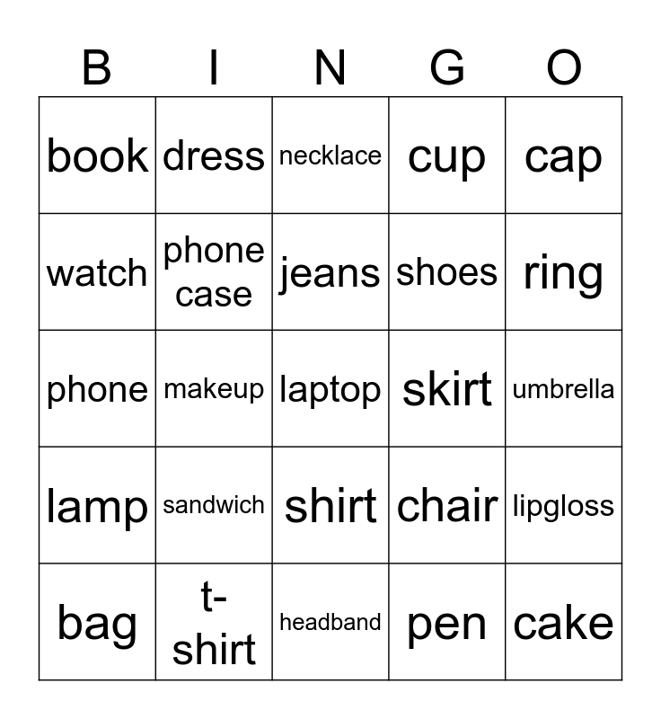 This bingo card has a free space and 24 words: sandwich, t-shirt, jeans, bag, cap, book, watch, dress, skirt, shirt, shoes, phone, chair, lipgloss, phone case, pen, umbrella, necklace, ring, makeup, cake, lamp, cup and headband.