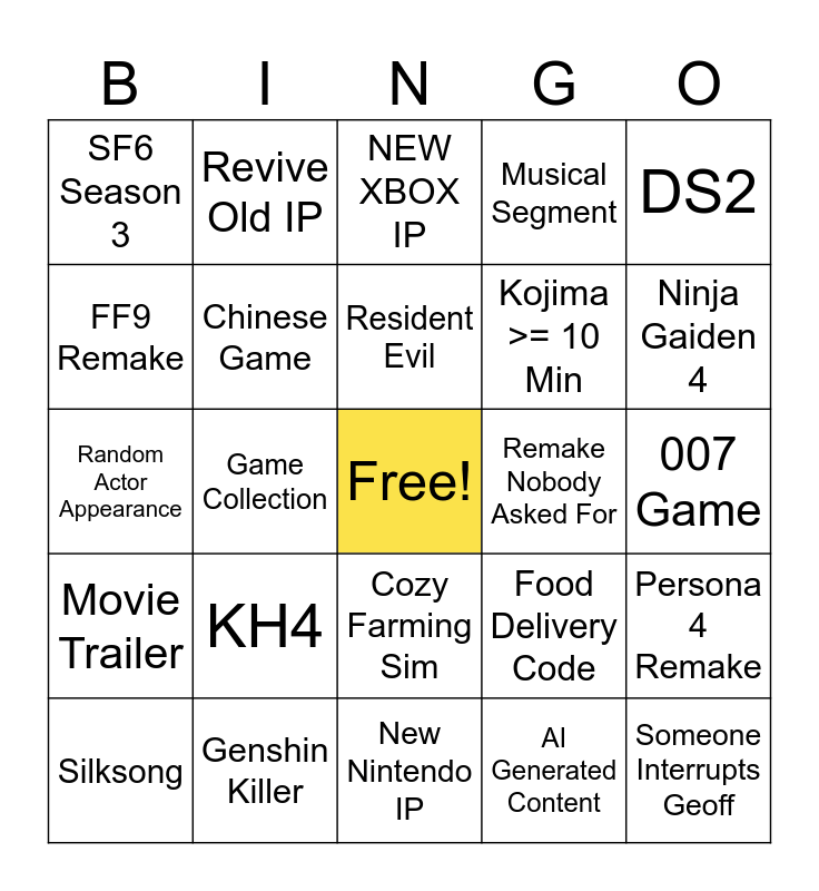This bingo card has a free space and 24 words: KH4, Genshin Killer, Resident Evil, Silksong, DS2, SF6 Season 3, FF9 Remake, Revive Old IP, Remake Nobody Asked For, Cozy Farming Sim, Kojima >= 10 Min, Random Actor Appearance, Food Delivery Code, Persona 4 Remake, Chinese Game, AI Generated Content, 007 Game, NEW XBOX IP, Ninja Gaiden 4, Game Collection, Someone Interrupts Geoff, Movie Trailer, Musical Segment and New Nintendo IP.