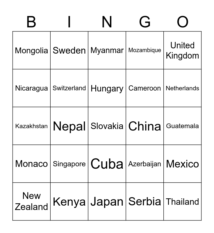 This bingo card has 90 words: Argentina, Armenia, Cuba, Cyprus, Denmark, Dominican Republic, Estonia, Ethiopia, Finland, Germany, Ghana, Greece, Grenada, Guatemala, Honduras, Hungary, Iceland, Indonesia, Iran, Iraq, Ireland, Jamaica, Japan, Jordan, Kazakhstan, Kenya, Latvia, Liberia, Libya, Liechtenstein, Mauritania, Mexico, Micronesia, Monaco, Mongolia, Mozambique, Myanmar, Namibia, Nepal, Netherlands, New Zealand, Nicaragua, Papua New Guinea, Australia, Austria, Azerbaijan, Bahamas, Bangladesh, Belarus, Belgium, Cambodia, Cameroon, Canada,, Central African Republic, Chad, Chile, China, Colombia, Paraguay, Peru, Philippines, Poland, Portugal, Romania, Russia, Rwanda, Senegal, Serbia, Seychelles, Sierra Leone, Singapore, Slovakia, Sudan, Suriname, Sweden, Switzerland, Syria, Taiwan, Tajikistan, Tanzania, Thailand, United Kingdom, United States of America, Uruguay, Uzbekistan, Venezuela, Vietnam, Yemen, Zambia and Zimbabwe.