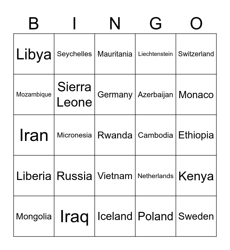This bingo card has 90 words: Uzbekistan, Venezuela, Vietnam, Yemen, Zambia, Zimbabwe, Argentina, Armenia, Cuba, Cyprus, Denmark, Dominican Republic, Estonia, Ethiopia, Finland, Germany, Ghana, Greece, Grenada, Guatemala, Honduras, Hungary, Iceland, Indonesia, Iran, Iraq, Ireland, Jamaica, Japan, Jordan, Kazakhstan, Kenya, Latvia, Liberia, Libya, Liechtenstein, Mauritania, Mexico, Micronesia, Monaco, Mongolia, Mozambique, Myanmar, Namibia, Nepal, Netherlands, New Zealand, Nicaragua, Papua New Guinea, Australia, Austria, Azerbaijan, Bahamas, Bangladesh, Belarus, Belgium, Cambodia, Cameroon, Canada,, Central African Republic, Chad, Chile, China, Colombia, Paraguay, Peru, Philippines, Poland, Portugal, Romania, Russia, Rwanda, Senegal, Serbia, Seychelles, Sierra Leone, Singapore, Slovakia, Sudan, Suriname, Sweden, Switzerland, Syria, Taiwan, Tajikistan, Tanzania, Thailand, United Kingdom, United States of America and Uruguay.