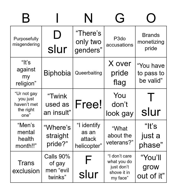 This bingo card has a free space and 24 words: Trans exclusion, “Where’s straight pride?”, Queerbaiting, “I don’t care what you do just don’t shove it in my face”, Brands monetizing pride, Purposefully misgendering, D slur, “There’s only two genders”, You don’t look gay, T slur, “Ur not gay you just haven’t met the right one”, Biphobia, “What about the veterans?”, “It’s just a phase”, “It’s against my religion”, Calls 90% of gay men “evil twinks”, F slur, P3do accusations, “You have to pass to be valid”, “Men’s mental health month!!”, “Twink used as an insult”, “I identify as an attack helicopter”, X over pride flag and “You’ll grow out of it”.