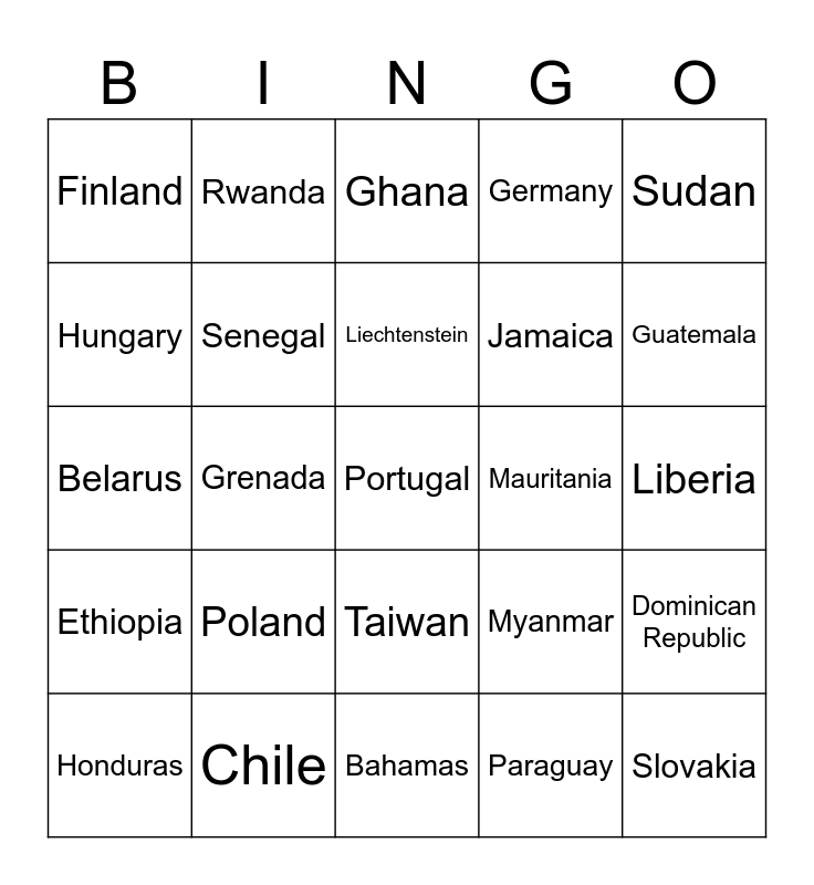 This bingo card has 90 words: Switzerland, Syria, Taiwan, Tajikistan, Tanzania, Thailand, United Kingdom, United States of America, Uruguay, Uzbekistan, Venezuela, Vietnam, Latvia, Liberia, Libya, Liechtenstein, Monaco, Mongolia, Armenia, Australia, Austria, Azerbaijan, Bahamas, Bangladesh, Belarus, Chile, China, Colombia, Cuba, Cyprus, Denmark, Dominican Republic, Estonia, Ethiopia, Finland, Germany, Ghana, Greece, Grenada, Guatemala, Honduras, Hungary, Iceland, Indonesia, Mozambique, Myanmar, Namibia, Argentina, Iran, Iraq, Ireland, Jamaica, Japan, Jordan, Kazakhstan, Kenya, Mauritania, Mexico, Micronesia, Yemen, Zambia, Zimbabwe, Nepal, Netherlands, New Zealand, Nicaragua, Papua New Guinea, Paraguay, Peru, Philippines, Poland, Portugal, Romania, Russia, Rwanda, Senegal, Serbia, Seychelles, Sierra Leone, Singapore, Slovakia, Sudan, Suriname, Sweden, Belgium, Cambodia, Cameroon, Canada,, Central African Republic and Chad.