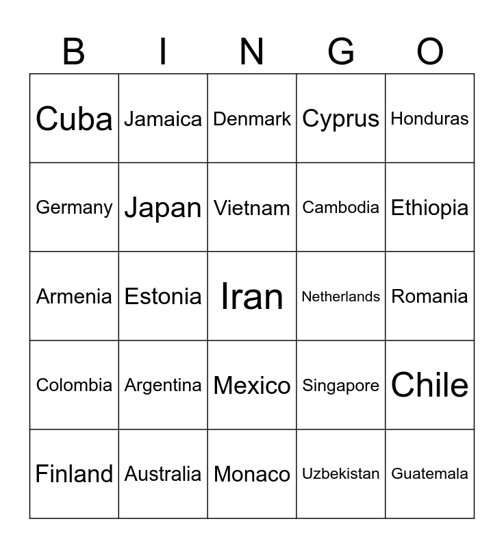 This bingo card has 90 words: Kenya, Mauritania, Mexico, Micronesia, Yemen, Zambia, Nicaragua, Papua New Guinea, Paraguay, Peru, Philippines, Poland, Portugal, Romania, Russia, Vietnam, Latvia, Liberia, Libya, Liechtenstein, Zimbabwe, Nepal, Monaco, Mongolia, Armenia, Australia, Austria, Azerbaijan, Bahamas, Bangladesh, Belarus, Chile, China, Colombia, Cuba, Cyprus, Denmark, Dominican Republic, Estonia, Ethiopia, Finland, Germany, Ghana, Seychelles, Sierra Leone, Singapore, Slovakia, Sudan, Suriname, Sweden, Belgium, Cambodia, Cameroon, Canada,, Central African Republic, Chad, Netherlands, New Zealand, Switzerland, Syria, Taiwan, Tajikistan, Tanzania, Thailand, United Kingdom, United States of America, Uruguay, Uzbekistan, Venezuela, Namibia, Argentina, Iran, Iraq, Ireland, Jamaica, Japan, Jordan, Kazakhstan, Greece, Grenada, Guatemala, Honduras, Hungary, Iceland, Indonesia, Mozambique, Myanmar, Rwanda, Senegal and Serbia.
