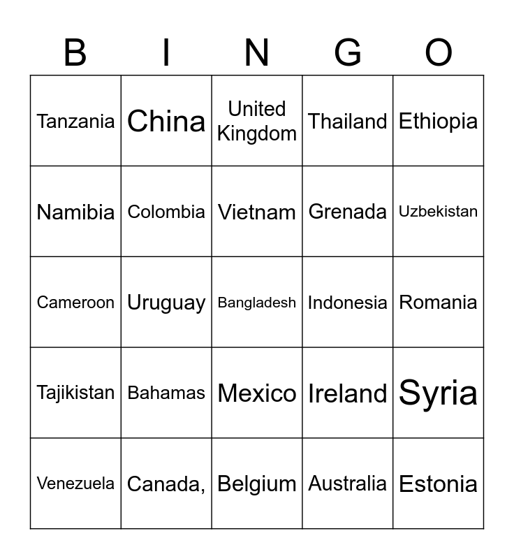 This bingo card has 90 words: Kenya, Mauritania, Mexico, Micronesia, Yemen, Zambia, Nicaragua, Papua New Guinea, Paraguay, Peru, Philippines, Poland, Portugal, Romania, Russia, Vietnam, Latvia, Liberia, Libya, Liechtenstein, Suriname, Sweden, Belgium, Cambodia, Cameroon, Canada,, Central African Republic, Chad, Netherlands, New Zealand, Switzerland, Syria, Taiwan, Tajikistan, Tanzania, Thailand, United Kingdom, United States of America, Uruguay, Uzbekistan, Venezuela, Namibia, Argentina, Iran, Iraq, Ireland, Jamaica, Japan, Jordan, Kazakhstan, Greece, Grenada, Guatemala, Honduras, Hungary, Iceland, Indonesia, Mozambique, Myanmar, Rwanda, Senegal, Serbia, Zimbabwe, Nepal, Monaco, Mongolia, Armenia, Australia, Austria, Azerbaijan, Bahamas, Bangladesh, Belarus, Chile, China, Colombia, Cuba, Cyprus, Denmark, Dominican Republic, Estonia, Ethiopia, Finland, Germany, Ghana, Seychelles, Sierra Leone, Singapore, Slovakia and Sudan.