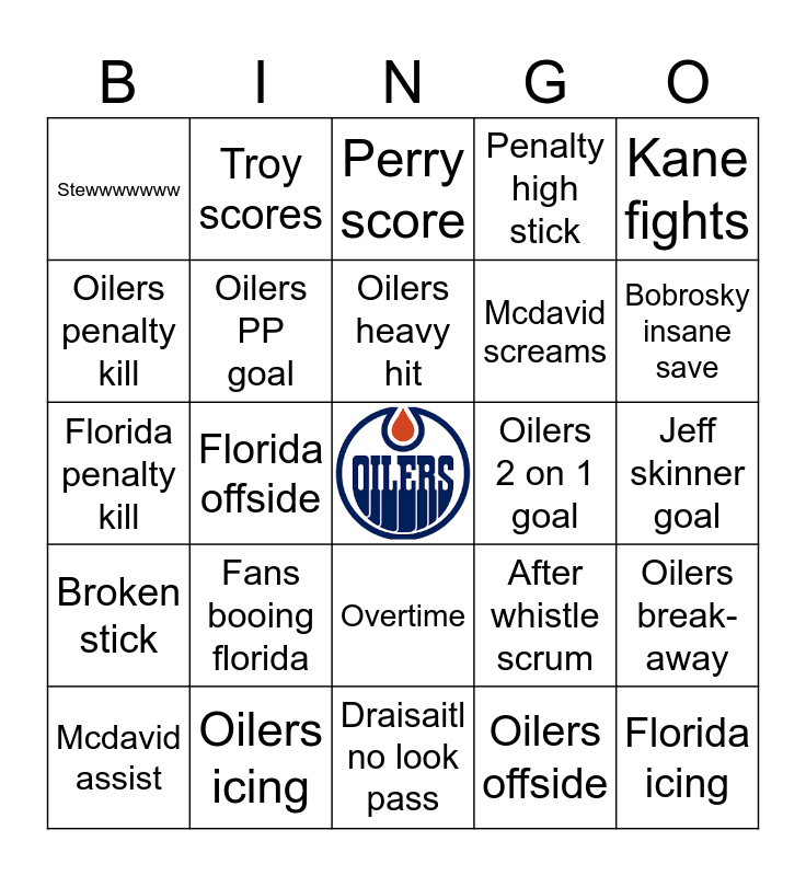 This bingo card has a free space and 27 words: After whistle scrum, Empty net goal, Mcdavid screams, Draisaitl no look pass, Oilers penalty kill, Perry score, Troy scores, Broken stick, Oilers 2 on 1 goal, Oilers break-away, Florida penalty kill, Penalty high stick, Mcdavid assist, Oilers icing, Bobrosky insane save, Brock spills, Oilers PP goal, Oilers heavy hit, Fans booing florida, Stewwwwwww, Jeff skinner goal, Oilers offside, Florida offside, Florida icing, Overtime, Kane fights and Skinner hair flip.
