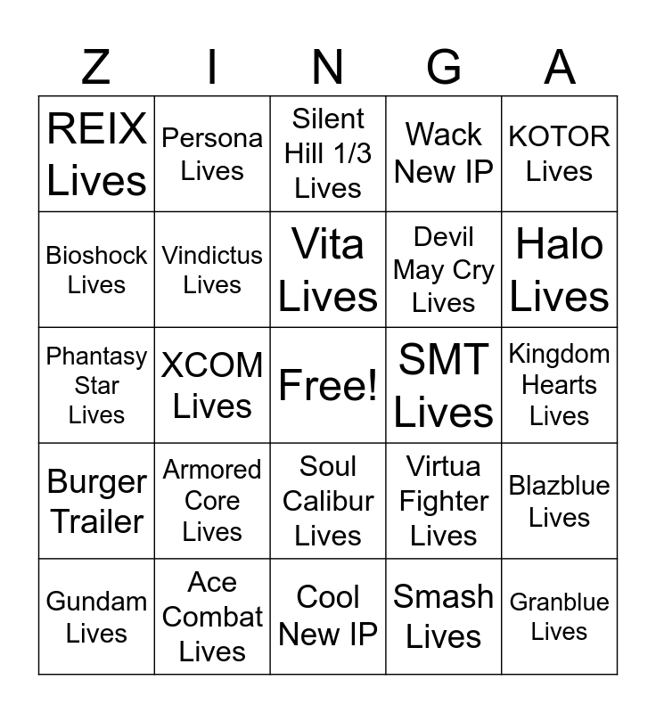 This bingo card has a free space and 24 words: Armored Core Lives, Ace Combat Lives, Vita Lives, Gundam Lives, KOTOR Lives, REIX Lives, Bioshock Lives, Persona Lives, SMT Lives, Soul Calibur Lives, Devil May Cry Lives, Phantasy Star Lives, Virtua Fighter Lives, Blazblue Lives, Vindictus Lives, Smash Lives, Kingdom Hearts Lives, Silent Hill 1/3 Lives, Halo Lives, XCOM Lives, Granblue Lives, Burger Trailer, Wack New IP and Cool New IP.