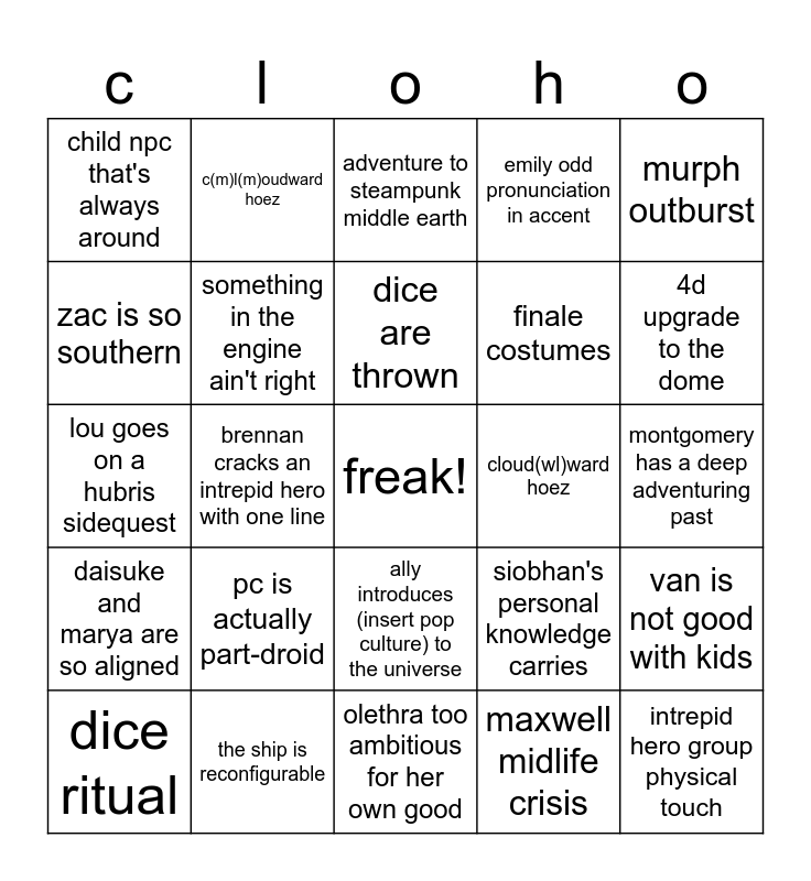 This bingo card has a free space and 24 words: pc is actually part-droid, the ship is reconfigurable, dice are thrown, dice ritual, murph outburst, child npc that's always around, zac is so southern, c(m)l(m)oudward hoez, cloud(wl)ward hoez, ally introduces (insert pop culture) to the universe, finale costumes, lou goes on a hubris sidequest, siobhan's personal knowledge carries, van is not good with kids, something in the engine ain't right, maxwell midlife crisis, montgomery has a deep adventuring past, adventure to steampunk middle earth, 4d upgrade to the dome, brennan cracks an intrepid hero with one line, intrepid hero group physical touch, daisuke and marya are so aligned, emily odd pronunciation in accent and olethra too ambitious for her own good.
