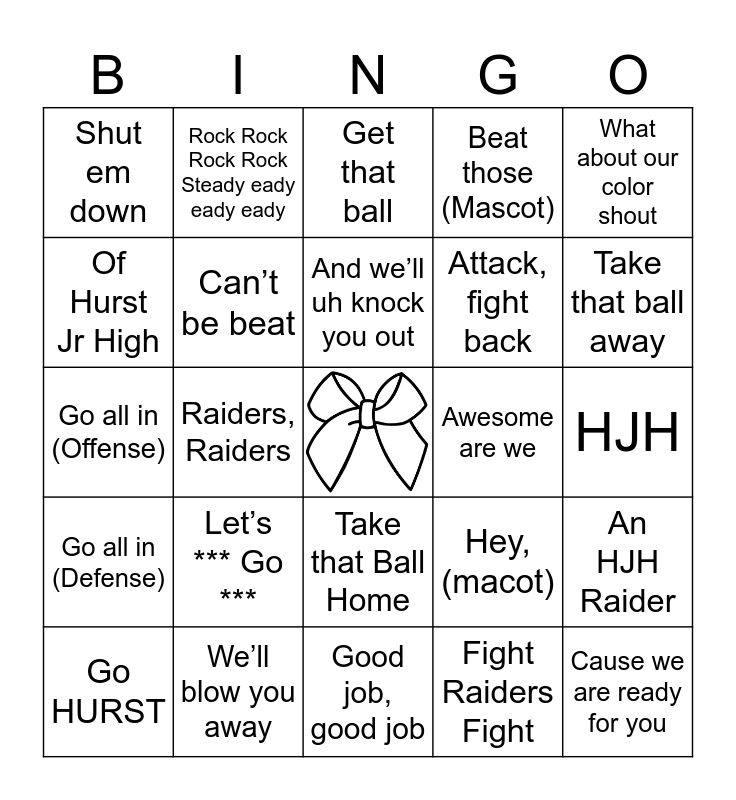 This bingo card has a free space and 53 words: Raiders, Hit It, Cause we are ready for you, Shake it Off, Shake it Off, Fight Raiders Fight, Let’s *** Go ***, All the way down, Rock Rock Rock Rock Steady eady eady eady, R-AI-DERS, The Best, Of Hurst Jr High, Hurst Red Raiders ** Are Here to Fight, Can’t be beat, Let’s Defeat Em, An HJH Raider, Hey, (macot), Hey, Hey, Go HURST, And we’ll uh knock you out, Awesome are we, Defense, get tough, What about our color shout, Raiders, Raiders, HJH All the way!, Attack, fight back, Shut em down, Yell a Little Louder, We’ll blow you away, R-O-W D-Y, Hustle Raiders, Hustle, Go! Go!, Take that ball away, Defense, let’s go, Everybody Yell, Raider Nation, Go Rai-Ders, Come on Raiders, Show your pride, Raiders, let’s Win, Beat those (Mascot), Good job, good job, Get that ball, Move that ball, This is Raider Territory, Score, Raiders, Score, HJH, Win, Win, H-J-H, Take that Ball Home, Get that Ball Back, HJH Spell it Out, Go all in (Offense), Go all in (Defense), Move the Ball, let’s score, Let’s Go Raiders, Go Fight Win and Rock It.