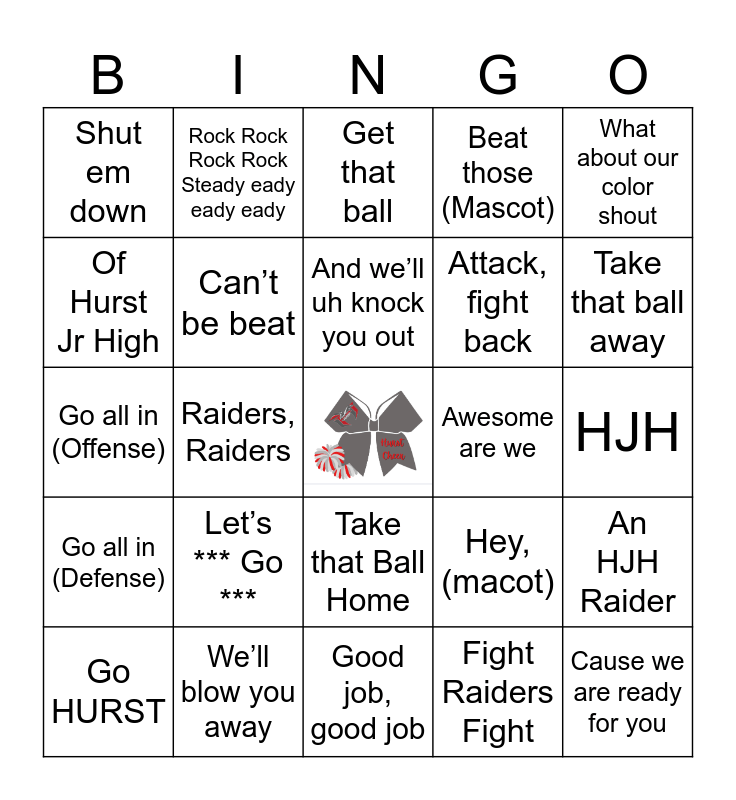 This bingo card has a free space and 53 words: Raiders, Hit It, Cause we are ready for you, Shake it Off, Shake it Off, Fight Raiders Fight, Let’s *** Go ***, All the way down, Rock Rock Rock Rock Steady eady eady eady, R-AI-DERS, The Best, Of Hurst Jr High, Hurst Red Raiders ** Are Here to Fight, Can’t be beat, Let’s Defeat Em, An HJH Raider, Hey, (macot), Hey, Hey, Go HURST, And we’ll uh knock you out, Awesome are we, Defense, get tough, What about our color shout, Raiders, Raiders, HJH All the way!, Attack, fight back, Shut em down, Yell a Little Louder, We’ll blow you away, R-O-W D-Y, Hustle Raiders, Hustle, Go! Go!, Take that ball away, Defense, let’s go, Everybody Yell, Raider Nation, Go Rai-Ders, Come on Raiders, Show your pride, Raiders, let’s Win, Beat those (Mascot), Good job, good job, Get that ball, Move that ball, This is Raider Territory, Score, Raiders, Score, HJH, Win, Win, H-J-H, Take that Ball Home, Get that Ball Back, HJH Spell it Out, Go all in (Offense), Go all in (Defense), Move the Ball, let’s score, Let’s Go Raiders, Go Fight Win and Rock It.