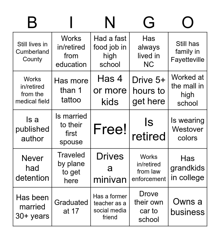 This bingo card has a free space and 24 words: Traveled by plane to get here, Graduated at 17, Has 4 or more kids, Has been married 30+ years, Still has family in Fayetteville, Still lives in Cumberland County, Works in/retired from the medical field, Works in/retired from education, Is retired, Drives a minivan, Drive 5+ hours to get here, Is a published author, Works in/retired from law enforcement, Has grandkids in college, Has more than 1 tattoo, Drove their own car to school, Is wearing Westover colors, Had a fast food job in high school, Worked at the mall in high school, Is married to their first spouse, Owns a business, Never had detention, Has always lived in NC and Has a former teacher as a social media friend.