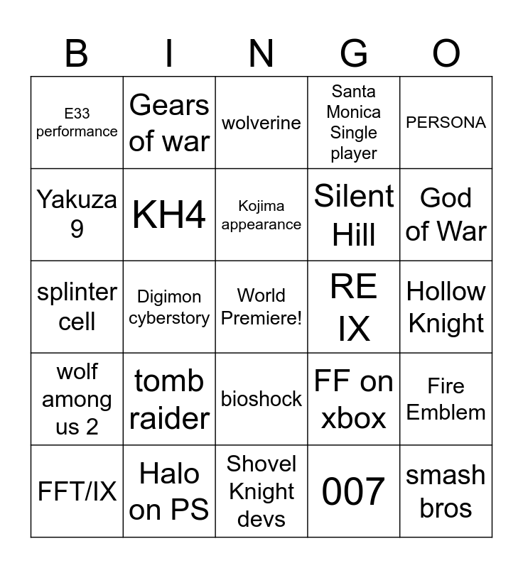 This bingo card has a free space and 24 words: tomb raider, Halo on PS, Kojima appearance, FFT/IX, PERSONA, E33 performance, Yakuza 9, Gears of war, RE IX, bioshock, Silent Hill, splinter cell, FF on xbox, Fire Emblem, KH4, 007, Hollow Knight, wolverine, God of War, Digimon cyberstory, smash bros, wolf among us 2, Santa Monica Single player and Shovel Knight devs.