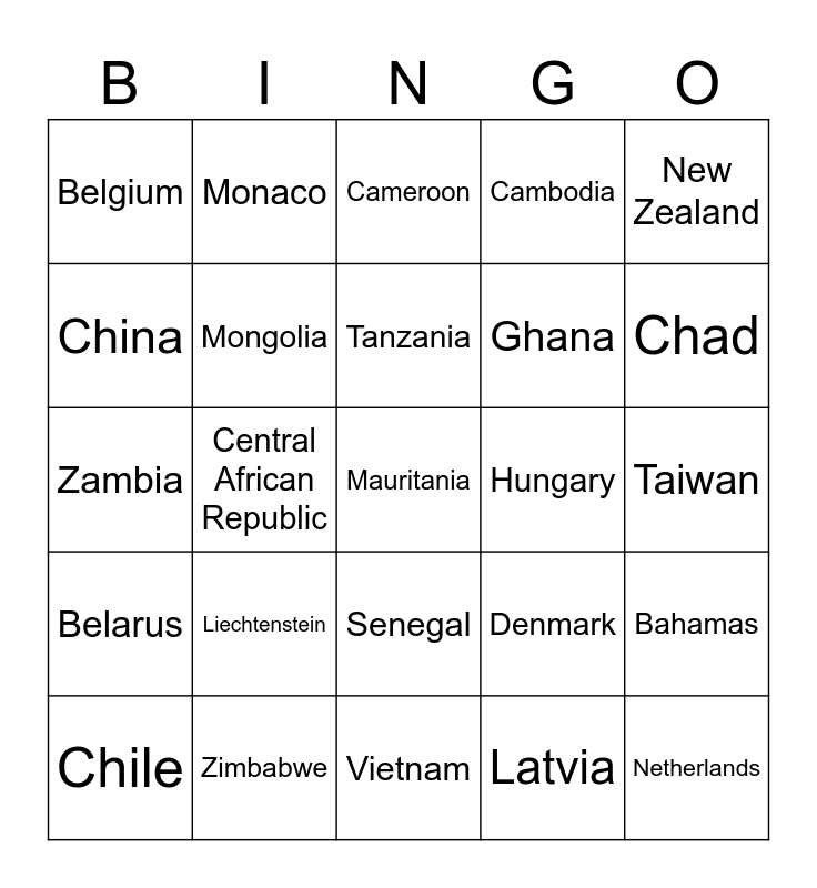This bingo card has 90 words: Russia, Rwanda, Senegal, Serbia, Seychelles, Sierra Leone, Singapore, Slovakia, Sudan, Suriname, Sweden, Switzerland, Syria, Taiwan, Tajikistan, Tanzania, Thailand, United Kingdom, United States of America, Uruguay, Uzbekistan, Venezuela, Vietnam, Yemen, Zambia, Zimbabwe, Argentina, Armenia, Australia, Austria, Azerbaijan, Bahamas, Bangladesh, Belarus, Belgium, Cambodia, Cameroon, Canada,, Central African Republic, Chad, Chile, China, Colombia, Cuba, Cyprus, Denmark, Dominican Republic, Estonia, Ethiopia, Finland, Germany, Ghana, Greece, Grenada, Guatemala, Honduras, Hungary, Iceland, Indonesia, Iran, Iraq, Ireland, Jamaica, Japan, Jordan, Kazakhstan, Kenya, Latvia, Liberia, Libya, Liechtenstein, Mauritania, Mexico, Micronesia, Monaco, Mongolia, Mozambique, Myanmar, Namibia, Nepal, Netherlands, New Zealand, Nicaragua, Papua New Guinea, Paraguay, Peru, Philippines, Poland, Portugal and Romania.