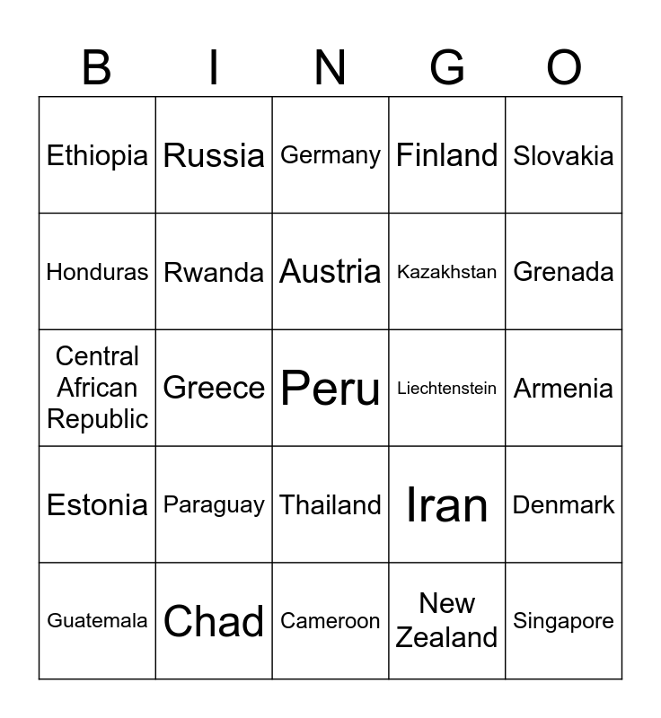 This bingo card has 90 words: Tajikistan, Tanzania, Thailand, United Kingdom, United States of America, Uruguay, Uzbekistan, Venezuela, Vietnam, Yemen, Zambia, Zimbabwe, Argentina, Armenia, Australia, Austria, Azerbaijan, Bahamas, Bangladesh, Belarus, Belgium, Cambodia, Cameroon, Canada,, Central African Republic, Chad, Chile, China, Colombia, Cuba, Cyprus, Denmark, Dominican Republic, Estonia, Ethiopia, Finland, Germany, Ghana, Greece, Grenada, Guatemala, Honduras, Hungary, Iceland, Indonesia, Iran, Iraq, Ireland, Jamaica, Japan, Jordan, Kazakhstan, Kenya, Latvia, Liberia, Libya, Liechtenstein, Mauritania, Mexico, Micronesia, Monaco, Mongolia, Mozambique, Myanmar, Namibia, Nepal, Netherlands, New Zealand, Nicaragua, Papua New Guinea, Paraguay, Peru, Philippines, Poland, Russia, Rwanda, Senegal, Serbia, Seychelles, Sierra Leone, Singapore, Slovakia, Sudan, Suriname, Sweden, Switzerland, Syria, Taiwan, Portugal and Romania.