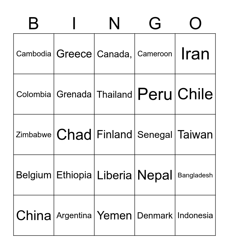 This bingo card has 90 words: Kenya, Latvia, Liberia, Libya, Liechtenstein, Mauritania, Mexico, Micronesia, Monaco, Mongolia, Mozambique, Switzerland, Syria, Taiwan, Portugal, Thailand, United Kingdom, United States of America, Uruguay, Uzbekistan, Venezuela, Vietnam, Yemen, Zambia, Zimbabwe, Argentina, Armenia, Australia, Austria, Azerbaijan, Bahamas, Bangladesh, Belarus, Belgium, Cambodia, Cameroon, Canada,, Central African Republic, Chad, Chile, China, Colombia, Cuba, Myanmar, Namibia, Nepal, Netherlands, New Zealand, Nicaragua, Papua New Guinea, Paraguay, Peru, Philippines, Poland, Russia, Rwanda, Senegal, Serbia, Seychelles, Sierra Leone, Singapore, Slovakia, Sudan, Suriname, Sweden, Romania, Cyprus, Denmark, Dominican Republic, Estonia, Ethiopia, Finland, Germany, Ghana, Greece, Grenada, Guatemala, Honduras, Hungary, Iceland, Indonesia, Iran, Iraq, Ireland, Jamaica, Japan, Jordan, Kazakhstan, Tajikistan and Tanzania.