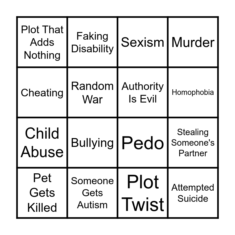This bingo card has 24 words: SP, Random Gun Violence, Homophobia, Racism, Cheating, Plot That Adds Nothing, Random War, Faking Disability, Someone Gets Autism, Poison, Child Abuse, Pedo, Karen, Assault, Authority Is Evil, Homeless Person, Plot Twist, Sexism, Bullying, Stealing Someone's Partner, Pet Gets Killed, Attempted Suicide, Murder and Flashbacks.