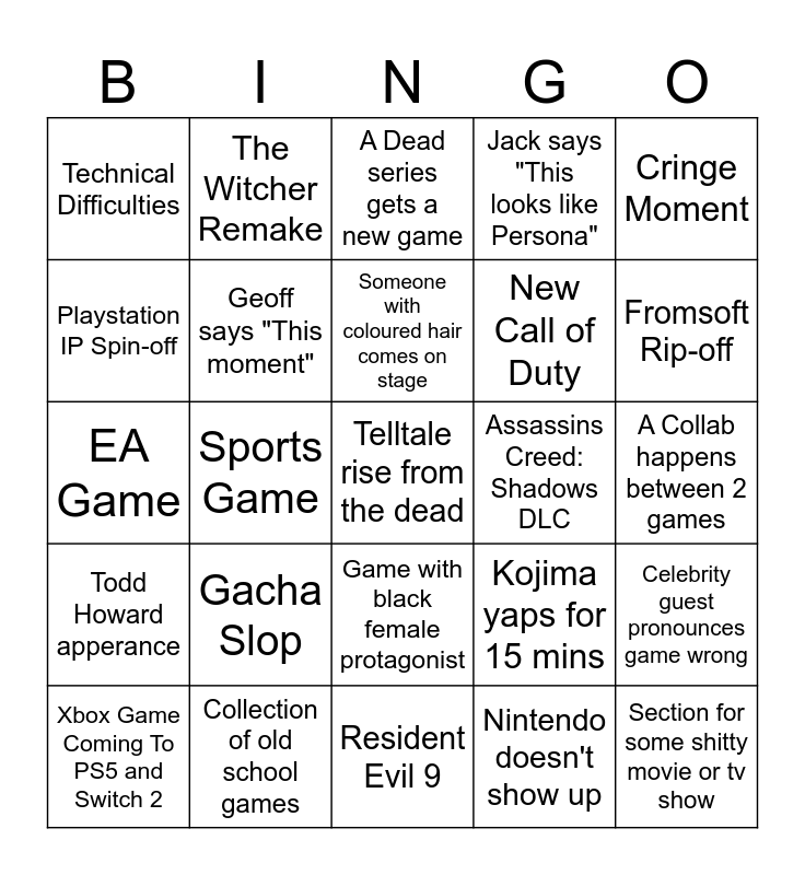 This bingo card has 25 words: Gacha Slop, Resident Evil 9, Someone with coloured hair comes on stage, Xbox Game Coming To PS5 and Switch 2, Cringe Moment, Technical Difficulties, Playstation IP Spin-off, The Witcher Remake, Assassins Creed: Shadows DLC, Game with black female protagonist, New Call of Duty, EA Game, Kojima yaps for 15 mins, Celebrity guest pronounces game wrong, Geoff says "This moment", Section for some shitty movie or tv show, A Collab happens between 2 games, A Dead series gets a new game, Fromsoft Rip-off, Sports Game, Telltale rise from the dead, Collection of old school games, Todd Howard apperance, Jack says "This looks like Persona" and Nintendo doesn't show up.