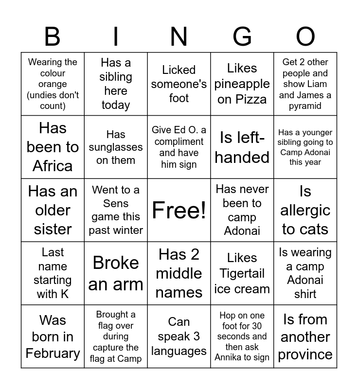 This bingo card has a free space and 24 words: Broke an arm, Brought a flag over during capture the flag at Camp, Give Ed O. a compliment and have him sign, Was born in February, Get 2 other people and show Liam and James a pyramid, Wearing the colour orange (undies don't count), Has been to Africa, Has a sibling here today, Has never been to camp Adonai, Has 2 middle names, Is left-handed, Has an older sister, Likes Tigertail ice cream, Is wearing a camp Adonai shirt, Has sunglasses on them, Hop on one foot for 30 seconds and then ask Annika to sign, Is allergic to cats, Licked someone's foot, Has a younger sibling going to Camp Adonai this year, Went to a Sens game this past winter, Is from another province, Last name starting with K, Likes pineapple on Pizza and Can speak 3 languages.