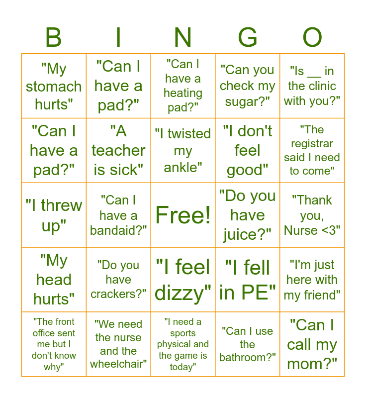 This bingo card has a free space and 29 words: "Can I have a pad?", "We need the nurse and the wheelchair", "Can I have a heating pad?", "Can I have my eyes checked?", "Is __ in the clinic with you?", "My stomach hurts", "A teacher is sick", "I twisted my ankle", "Do you have juice?", "I'm just here with my friend", "The front office sent me but I don't know why", "Can I have a bandaid?", "Can I use the bathroom?", "Can I call my mom?", "I threw up", "Can I have an ice pack?", "I need a sports physical and the game is today", "I fell in PE", "The registrar said I need to come", "My head hurts", "Do you have crackers?", "My teacher said I need to come", "I don't feel good", "Thank you, Nurse <3", "Can I have a pad?", "Can I have a pad?", "I feel dizzy", "Can you check my sugar?" and "I didn't eat lunch".