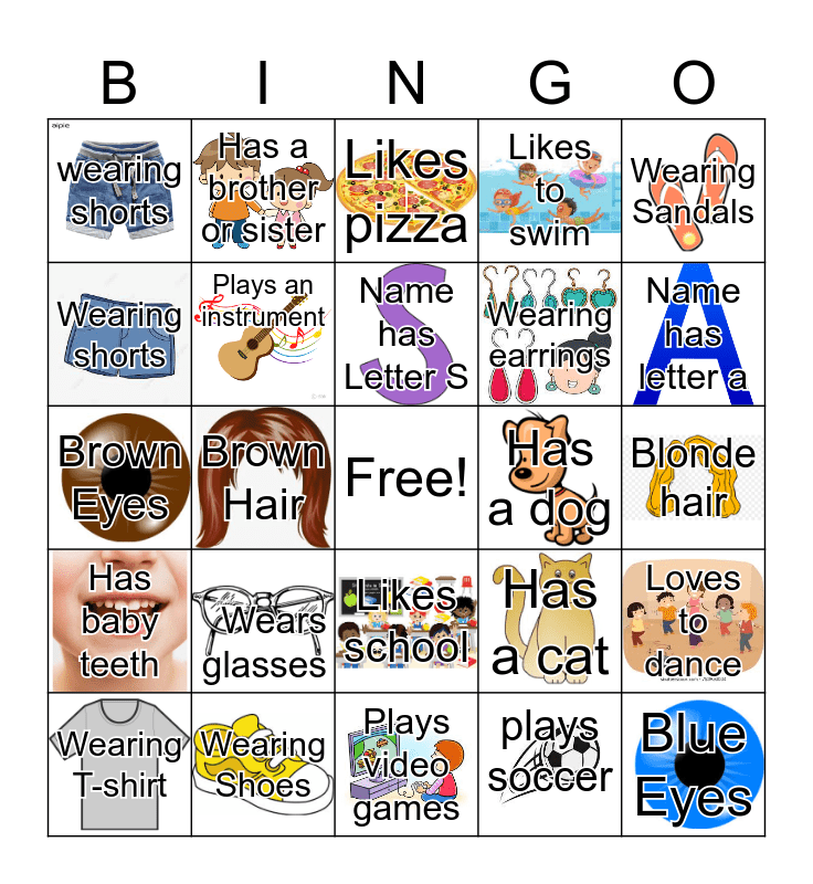This bingo card has 24 images, a free space and 24 words: Wearing T-shirt, Wears glasses, Name has Letter S, plays soccer, Wearing Sandals, wearing shorts, Has a brother or sister, Likes pizza, Has a dog, Blonde hair, Brown Eyes, Plays an instrument, Has a cat, Loves to dance, Wearing shorts, Wearing Shoes, Plays video games, Likes to swim, Name has letter a, Has baby teeth, Brown Hair, Likes school, Wearing earrings and Blue Eyes.