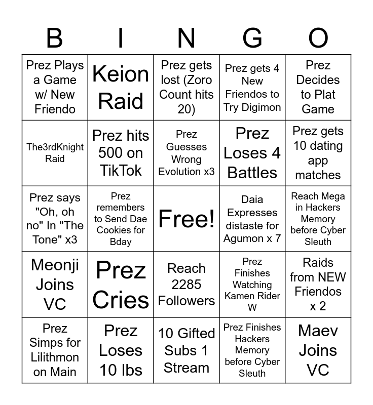 This bingo card has a free space and 24 words: Prez Cries, Prez Loses 10 lbs, Prez Guesses Wrong Evolution x3, Prez Simps for Lilithmon on Main, Prez Decides to Plat Game, Prez Plays a Game w/ New Friendo, The3rdKnight Raid, Keion Raid, Daia Expresses distaste for Agumon x 7, Reach 2285 Followers, Prez Loses 4 Battles, Prez says "Oh, oh no" In "The Tone" x3, Prez Finishes Watching Kamen Rider W, Raids from NEW Friendos x 2, Prez hits 500 on TikTok, Prez Finishes Hackers Memory before Cyber Sleuth, Reach Mega in Hackers Memory before Cyber Sleuth, Prez gets lost (Zoro Count hits 20), Prez gets 10 dating app matches, Prez remembers to Send Dae Cookies for Bday, Maev Joins VC, Meonji Joins VC, Prez gets 4 New Friendos to Try Digimon and 10 Gifted Subs 1 Stream.