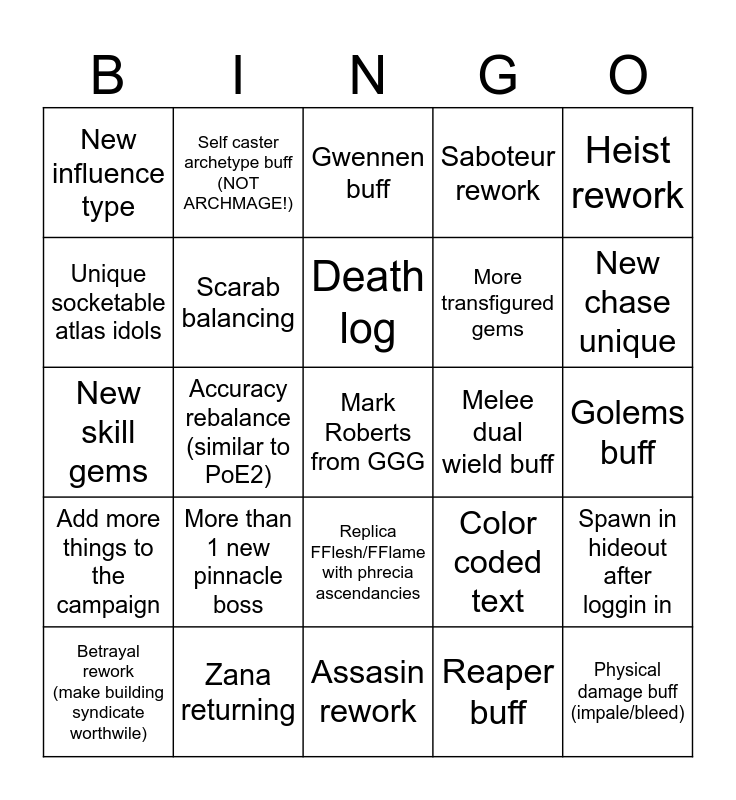 This bingo card has a free space and 24 words: More than 1 new pinnacle boss, Zana returning, Death log, Betrayal rework (make building syndicate worthwile), Heist rework, New influence type, Unique socketable atlas idols, Self caster archetype buff (NOT ARCHMAGE!), Melee dual wield buff, Replica FFlesh/FFlame with phrecia ascendancies, More transfigured gems, New skill gems, Color coded text, Spawn in hideout after loggin in, Scarab balancing, Reaper buff, Golems buff, Gwennen buff, New chase unique, Accuracy rebalance (similar to PoE2), Physical damage buff (impale/bleed), Add more things to the campaign, Saboteur rework and Assasin rework.