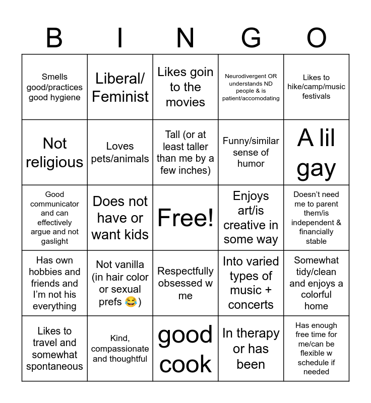 This bingo card has a free space and 24 words: Not vanilla (in hair color or sexual prefs ๐), Kind, compassionate and thoughtful, Tall (or at least taller than me by a few inches), Likes to travel and somewhat spontaneous, Likes to hike/camp/music festivals, Smells good/practices good hygiene, Not religious, Liberal/ Feminist, Enjoys art/is creative in some way, Respectfully obsessed w me, Funny/similar sense of humor, Good communicator and can effectively argue and not gaslight, Into varied types of music + concerts, Somewhat tidy/clean and enjoys a colorful home, Loves pets/animals, In therapy or has been, Doesnโt need me to parent them/is independent & financially stable, Likes goin to the movies, A lil gay, Does not have or want kids, Has enough free time for me/can be flexible w schedule if needed, Has own hobbies and friends and Iโm not his everything, Neurodivergent OR understands ND people & is patient/accomodating and good cook.